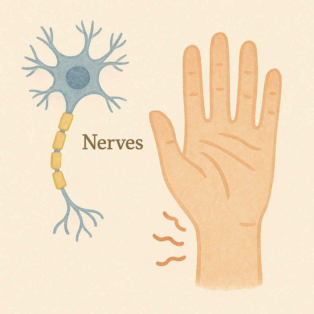 • Nerves: Peripheral nerve damage → Numbness, pain in hands and feet