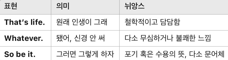 상황을 받아들이는 유연함, 가벼운 체념, 때로는 웃픈 현실 인식까지, 한마디로 표현할 수 있어 회화에서 정말 유용하게 쓰인답니다.